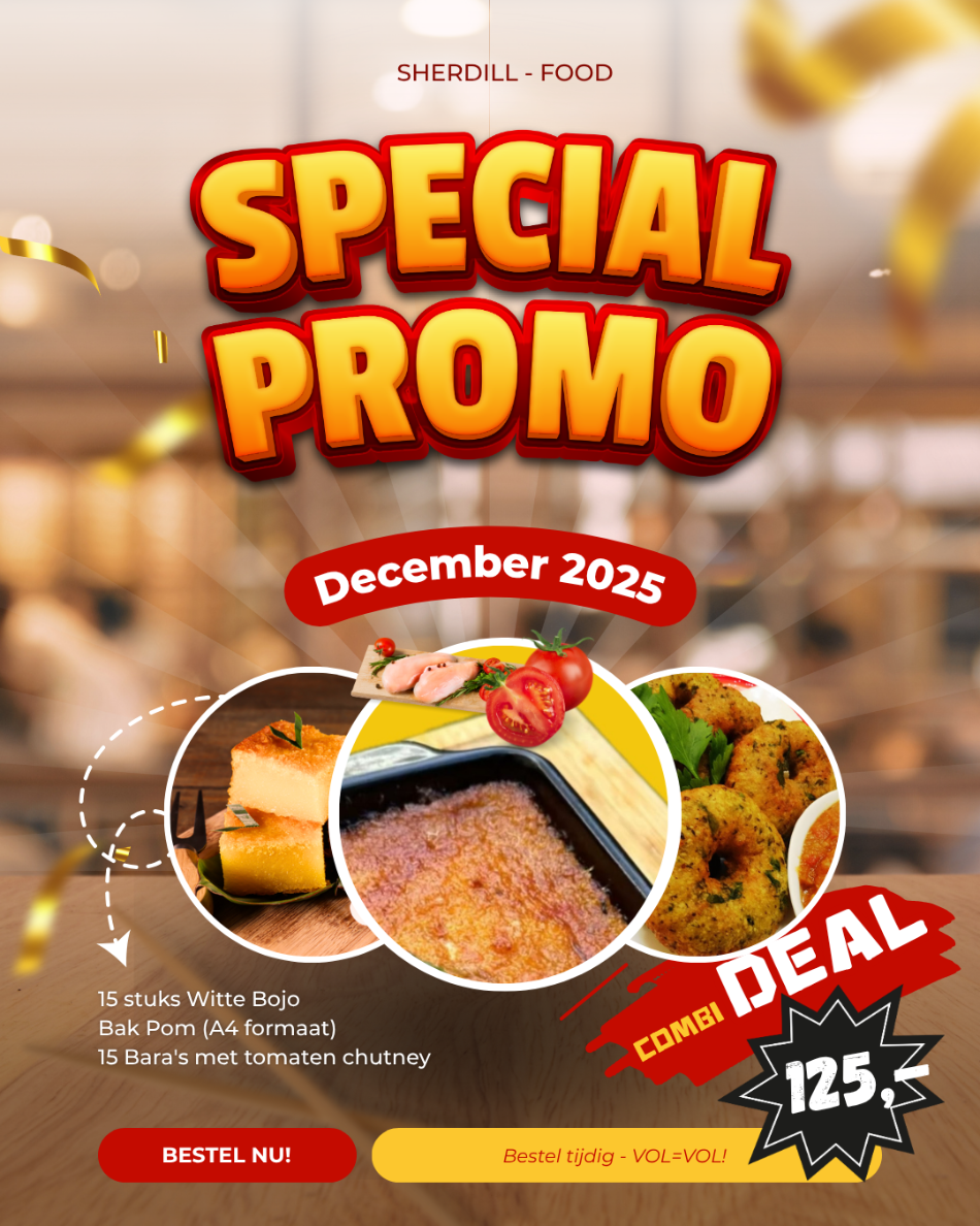 Verwen je gasten de komende feestmaand met een complete selectie van heerlijke Surinaamse, Indiase of Vegetarische hapjes en klassiekers. Vers bereid, rijk van smaak en ideaal voor elke kerstbrunch, oudjaarsfeest of familiebijeenkomst.